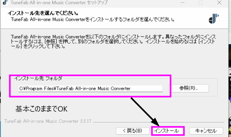 最後にソフトウェアを保存する場所を決める画面になります。基本的にそのまま「インストール」を押してOK。これで終了です!