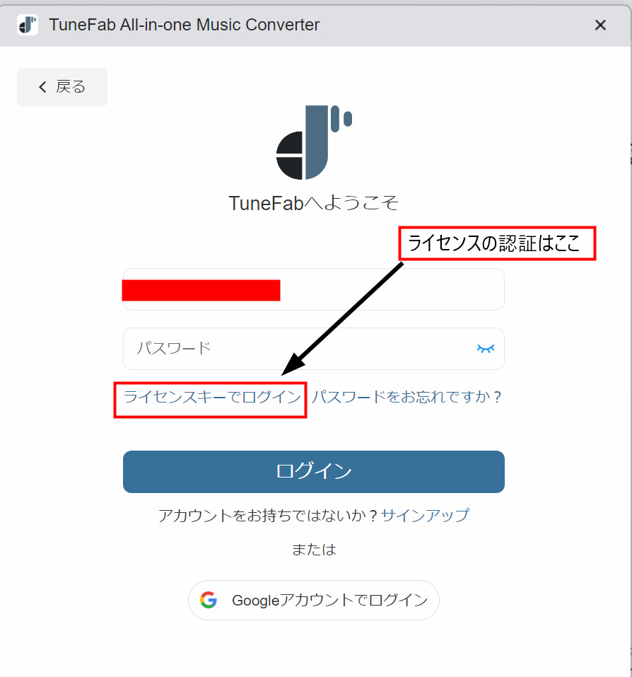 アカウントのボタンからサインイン画面に行きます。そこに「ライセンスキーでログイン」とあります。ここから登録したメールアドレスとライセンスを入力します。