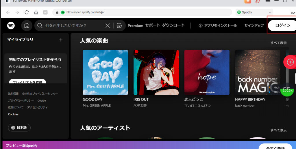 さて実際にTuneFabを使ってみました。操作はめっちゃ簡単で、ソフトウェアを起動→Spotifyにログイン→好きな曲を探して、ダウンロードするだけ。